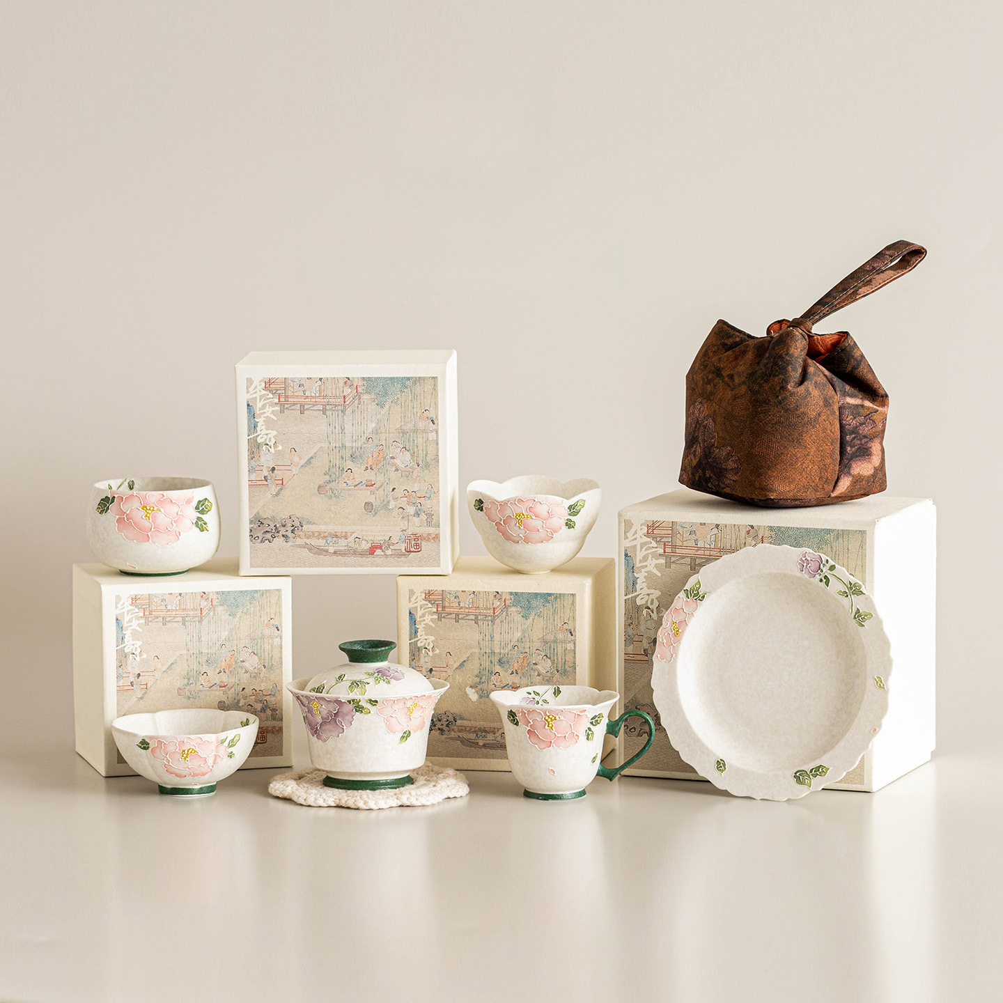汝窯牡丹花三才蓋碗茶杯套組