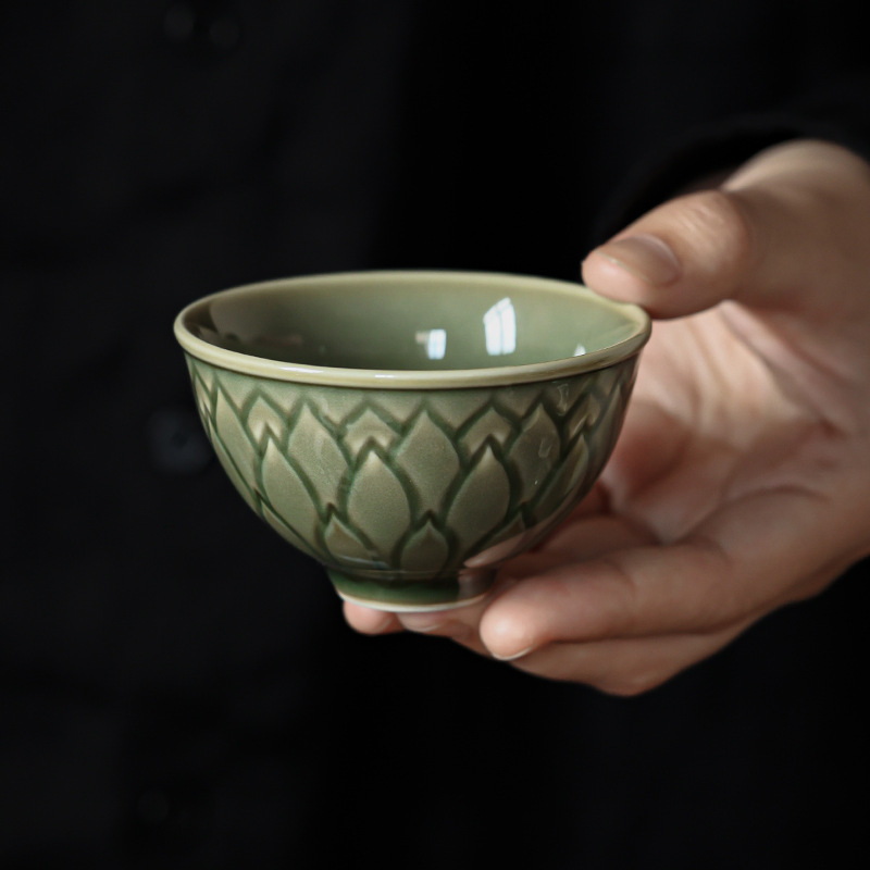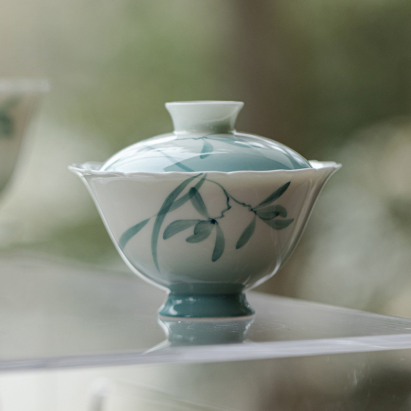 玉泥手繪蘭花漸變藍手繪花口蓋碗