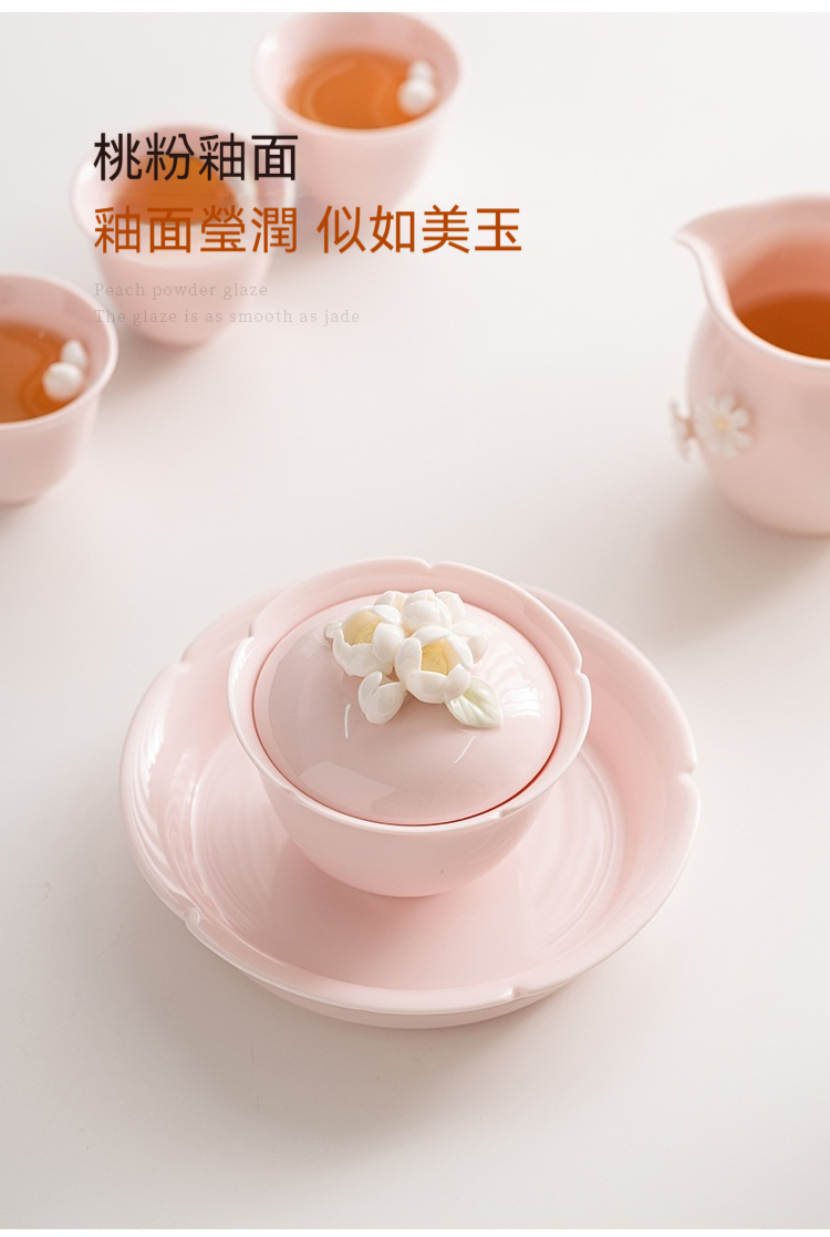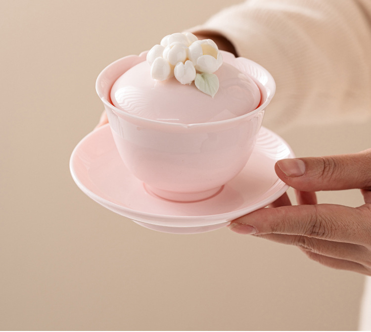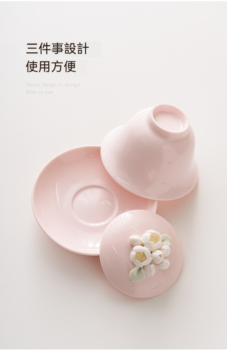 桃粉捏花三才蓋碗茶杯